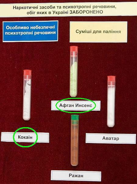Зокрема, на фото, яке поширила прес-служба глави держави, видно, що наркотик "кокаїн" був підписаний як "кокаін", а суміш для паління "Афган Інсенс" - як "Афган Инсенс".
