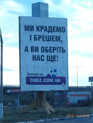 Нагадаємо, у Дніпродзержинську Дніпропетровської області з’явилися білборди з рекламою одного з місцевих інтернет-видань викликали невдоволення представників Партії регіонів, оскільки на одному з них зображена бабуся з котом і підпис: «Взнала, що онук голосував за «регіони» – переписала хату на кота». На другому білборді розміщено напис: «Ми крадемо і брешем, а ви оберіть нас ще!».