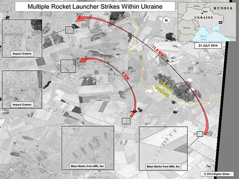 Перший знімок показує наслідки удару по українській території з реактивних систем залпового вогню, другий і третій – результати обстрілу з самохідної артилерії по українському військовому підрозділу. На четвертому знімку реактивні системи стріляли по цілях із території України біля самого кордону – на думку США, в цьому випадку йшлося про використання установок, наданих сепаратистам із Росії.