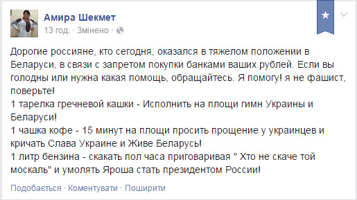 В особливо незручному становищі опинилися громадяни Росії, які приїхали у власних справах до Білорусі. За їх словами, в умовах, коли російські рублі не приймає жоден банк, у них немає можливості навіть купити елементарної їжі, не кажучи вже про бензин або квитки додому. Відносно пощастило лише власникам пластикових карт російських банків, які, як і раніше, приймаються до оплати в білоруських магазинах, проте за яким курсом відбувається тепер конвертація - не знають навіть їхні власники.