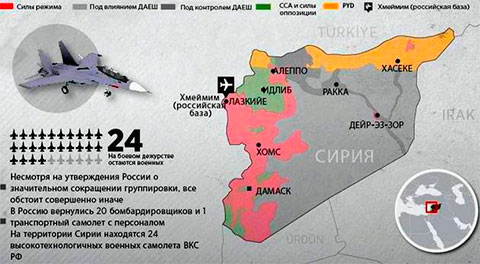 Як повідомлялося раніше, 15 березня перша група російських літаків вилетіла з авіабази Хмеймім в Сирії в пункти постійної дислокації на території РФ. А вже 23 березня із авіабази Хмеймім у Сирії вилетів до РФ військово-транспортний літак Іл-76 зі 160 російськими військовослужбовцями.
