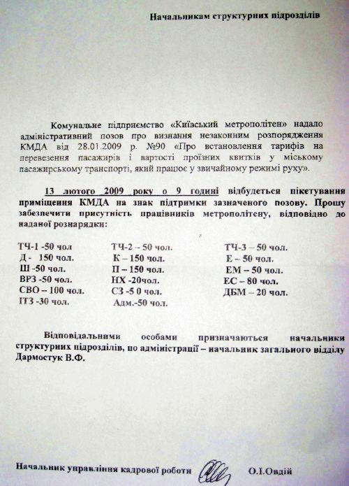 До “Української правди. Київ” потрапило фото рознарядки для метрополітенівців. Від цього комунально підприємства вимагали, щоб на мітинг прийшло 1200 людей.