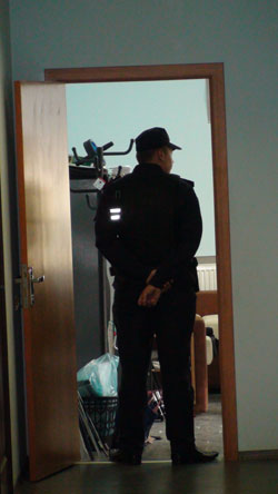 Потім – тиша. Я підводжуся з підлоги відкриваю двері. Дивлюся, біжить охоронець… Я йду ось до цієї коробки (показує коробку від якоїсь оргтехніки в глибині кімнати)… щось там одразу не розгледів бо вбіг охоронець. Питає: що таке?